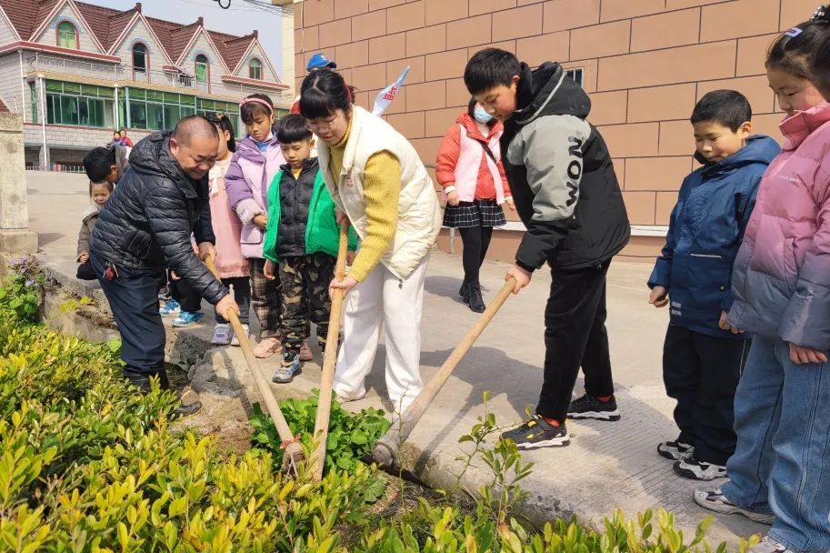 把课室拓展到大自然,在志愿者的引导下,孩子们来到去年亲手栽下的树苗旁,一起锄草、培土、浇水,争当“绿美少年”。