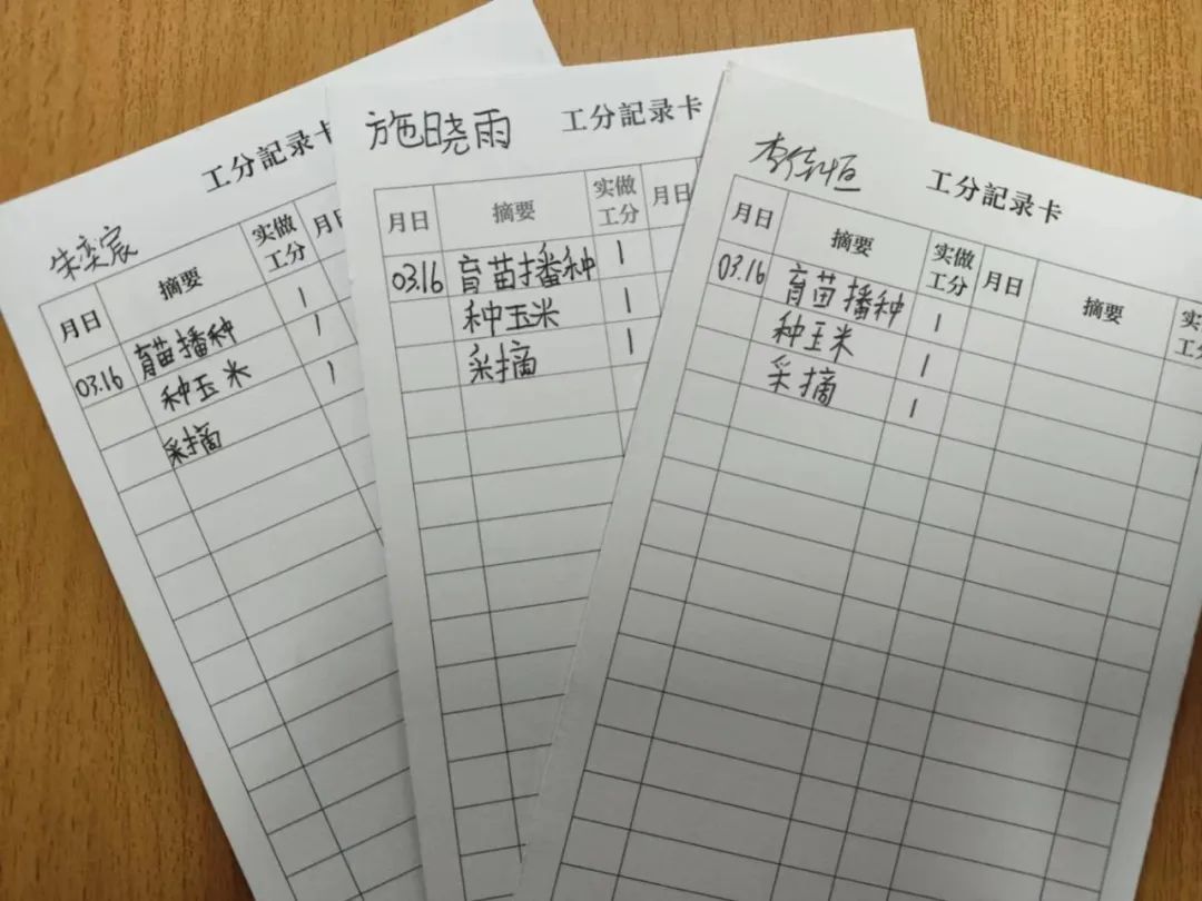 农耕活动结束后,每位孩子领到一张特别的工分记录卡。播种、栽苗、浇水、采摘,每完成一项农事劳作就记1分,积攒的工分可以兑换各类蔬菜、学习用品等,让孩子们也体验了一把父辈们以前劳动赚工分的劳作模式。