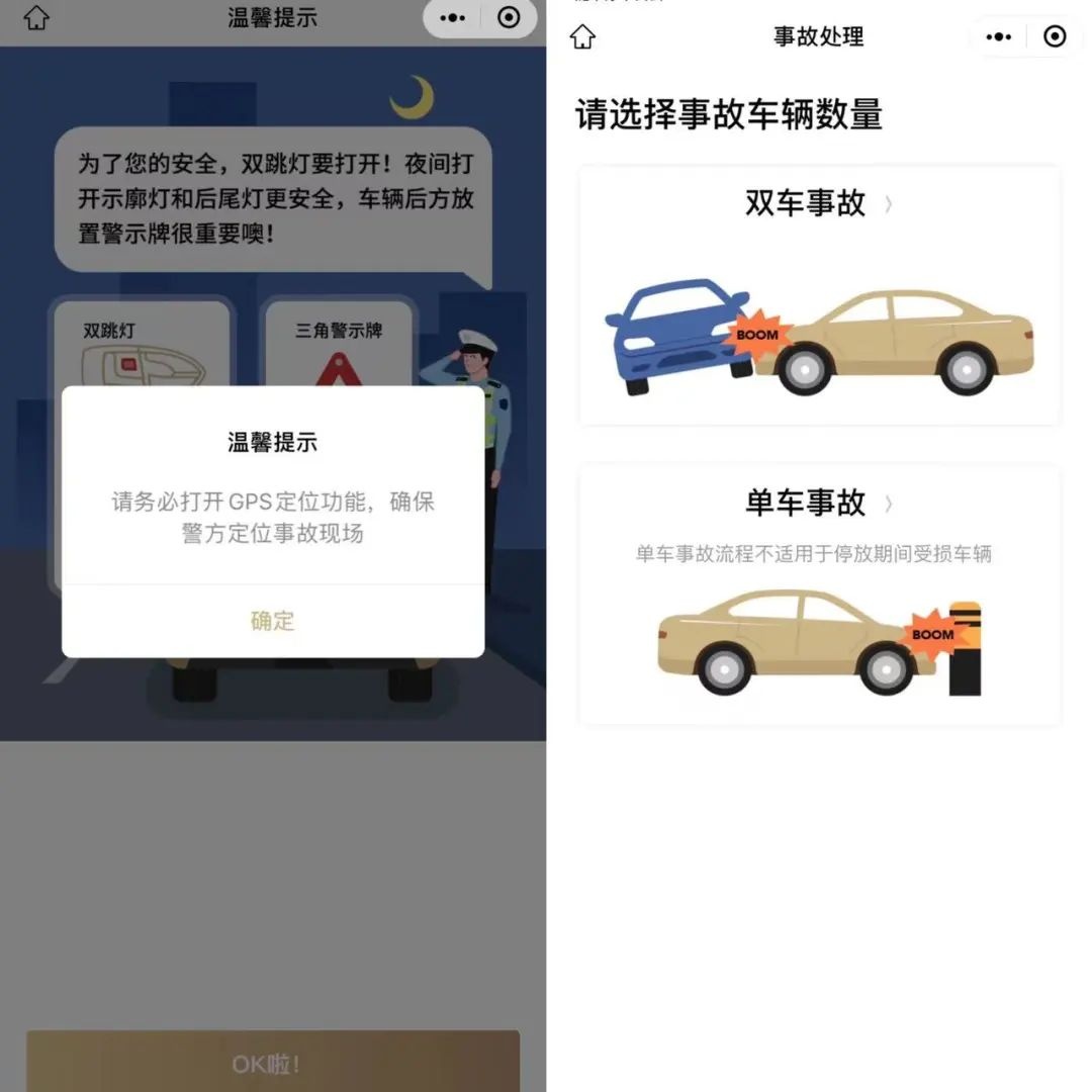 (三)选择事故类型,单车事故或双车事故(目前还不支持双车以上事故处理),依据页面流程提示继续进行后续操作流程。