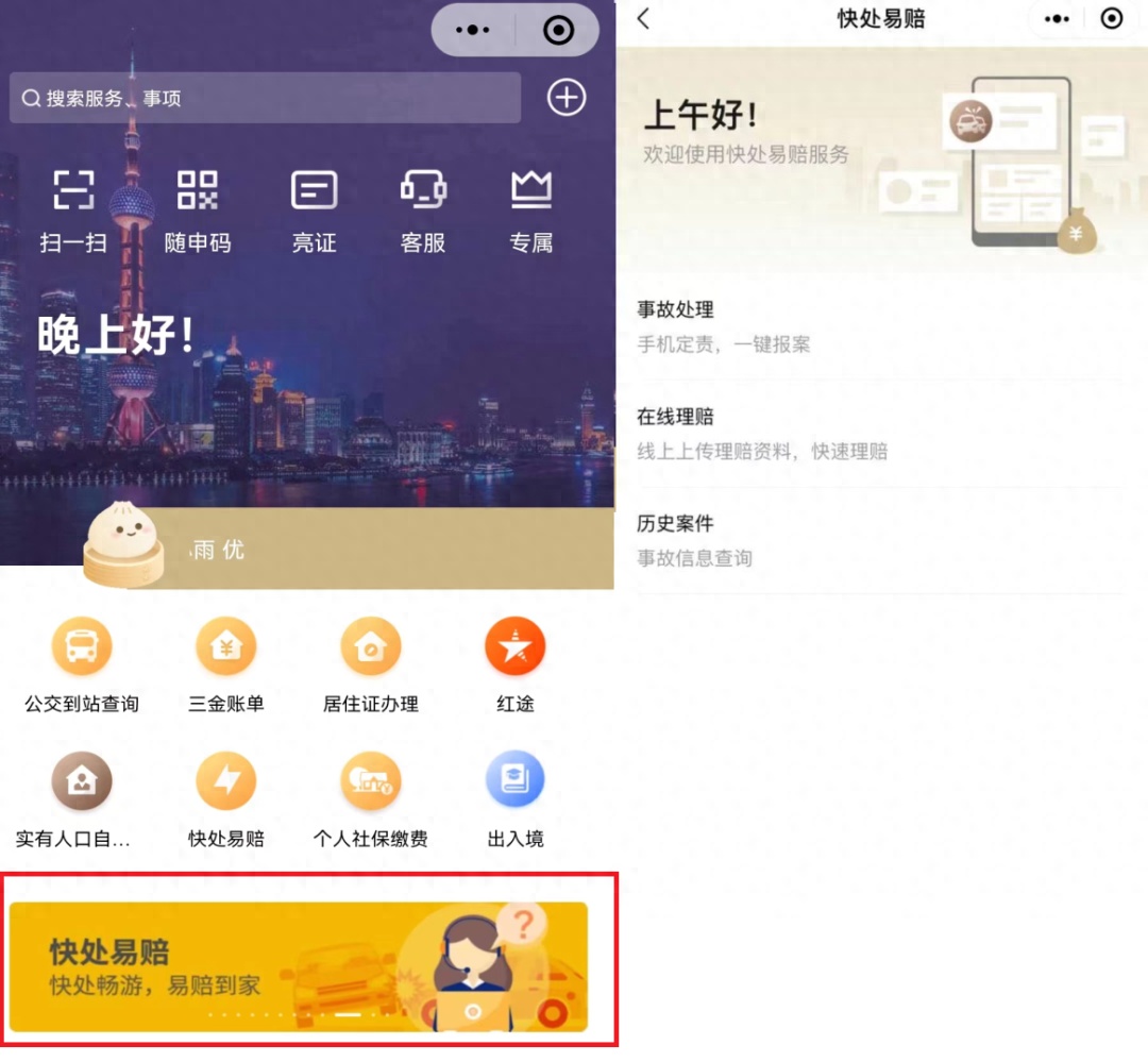 “随申办”小程序、“随申办”App首页点击【快处易赔】相关运营位即可进入相关服务。
