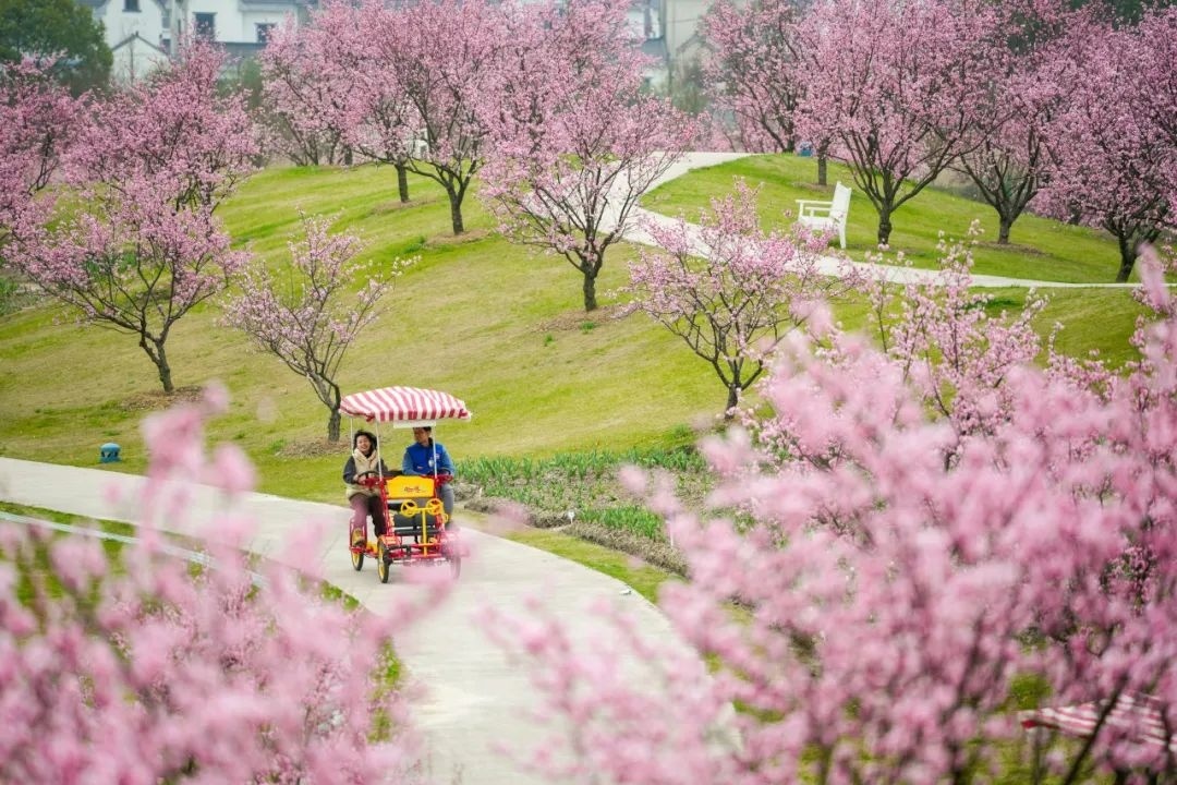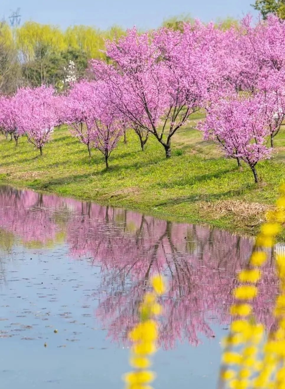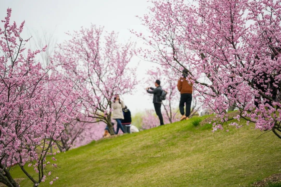 阳春三月, 金山区朱泾镇 花开海上生态园的800株美人梅绚丽盛开, 以其娇艳的色彩和繁茂的花姿, 成为了一道亮丽的风景线。