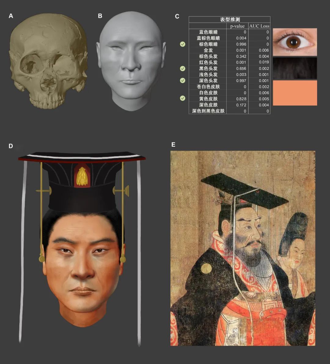 在研究中,团队以颅骨CT扫描技术对武帝进行了初步面貌复原。通过分析控制头发、皮肤和瞳孔色素相关的基因位点后,“我们可以推测出武帝是黑色头发、黄色皮肤和棕色眼睛,符合典型的东北亚、东亚人长相。”团队成员介绍。