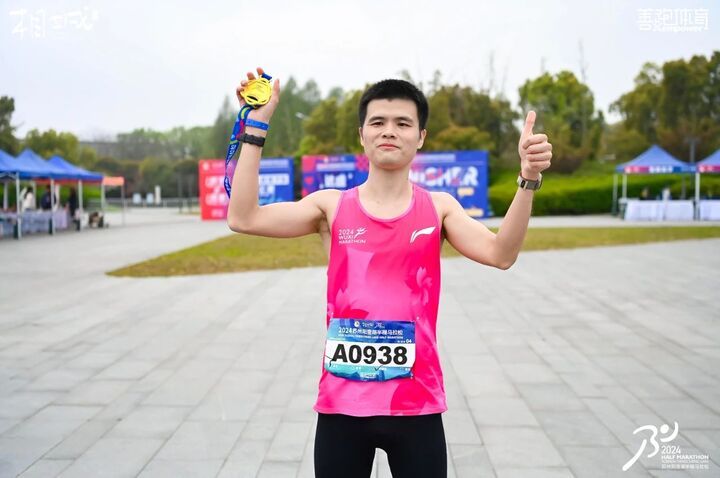 冲过终点后,选手们都获得了首届苏州阳澄湖半程马拉松的完赛奖牌,奖牌六边形的镂空设计融合了沿线的高铁之心、阳澄湖旅游集散中心等建筑元素,奖牌背面还设置了刻名区域,可将赛前领取的专属名牌嵌入,仪式感十足。