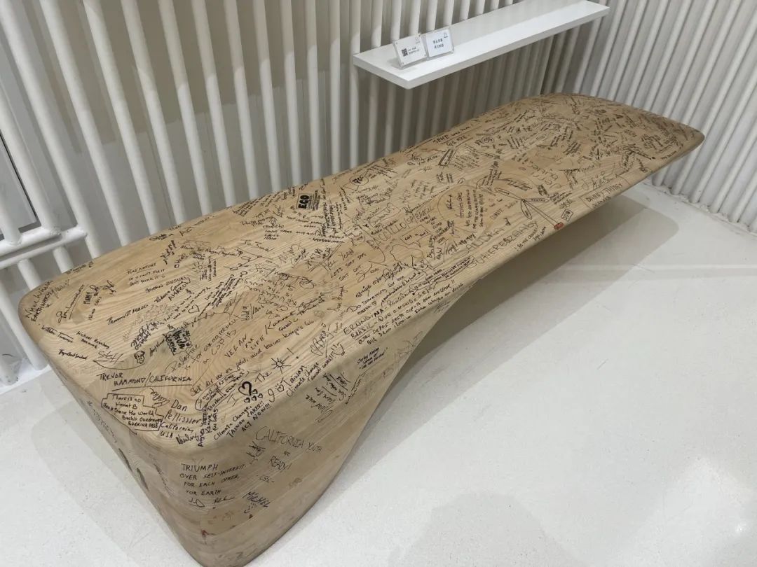 当参观者来到二楼,透过玻璃再次俯瞰这幅艺术作品时,又会惊喜地发现透明的玻璃上印着的话正好是那幅艺术品的作者所说。