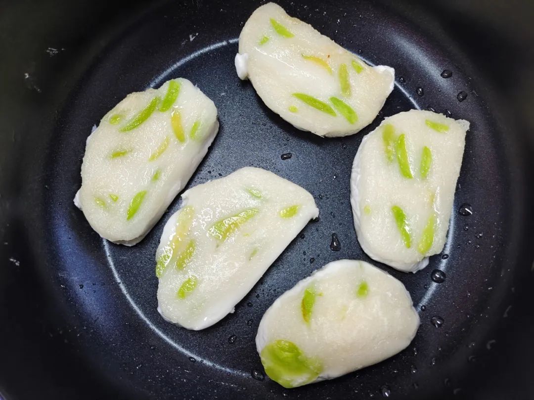 锅中加入少许食用油,放入切好的蚕豆糯米糍粑,煎至两面微黄就可以出锅了。