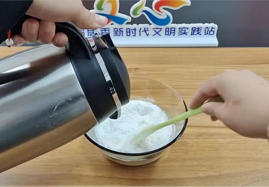 面粉中少量多次加入温水,边加边搅,搓成不粘手的面团。