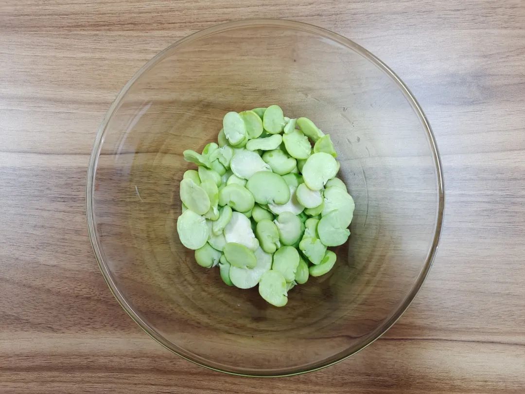 新鲜蚕豆剥壳去皮,把蚕豆从中间掰成两半,洗净沥干。