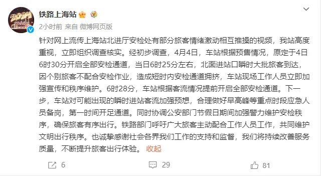 据网友爆料称,当时火车站安检口排队情况拥挤,旅客等待时间长,但安检口没有完全开放,导致安检速度缓慢,一些旅客因为赶高铁比较急与安检员发生了冲突,后来有乘客冲卡。4月5日上午,铁路上海站回应称,针对网上流传上海站北进厅安检处有部分旅客情绪激动相互推搡的视频,他们高度重视,立即组织调查核实。