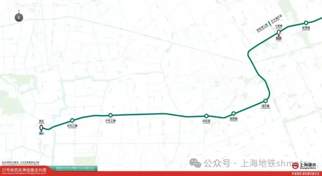 2022年12月16日,轨道交通12号线西延伸工程正式开工。该工程自轨道交通12号线七莘路站(不含)向西延伸,终于洞泾站,途经松江区和闵行区,线路全长约17.27公里,全部为地下线,共设6座车站,在洞泾站与轨道交通9号线实现换乘。