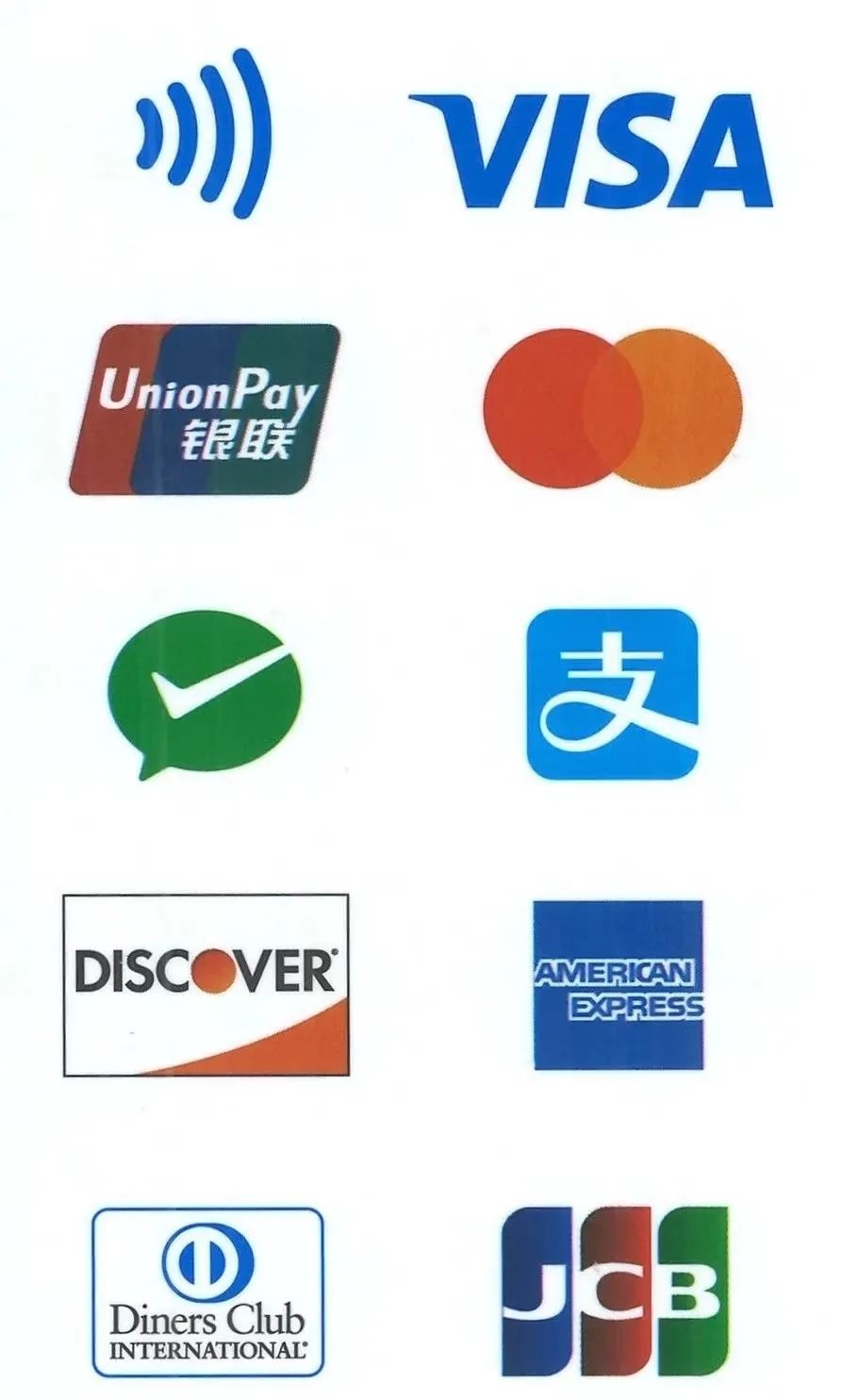 a) 外卡:维萨(VISA)、万事达(Master Card)、发现卡(Discover Card)、美国运通(AE)、大来(Diners Club)、吉士美(JCB)。