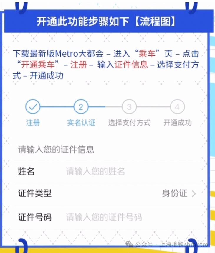 即日起,境外来沪人员在搭乘地铁通行时,可使用护照、港澳通行证、台胞证等在“Metro大都会”App上注册并绑定支付渠道后,即可通过“Metro大都会”App扫码过闸,先乘后付。