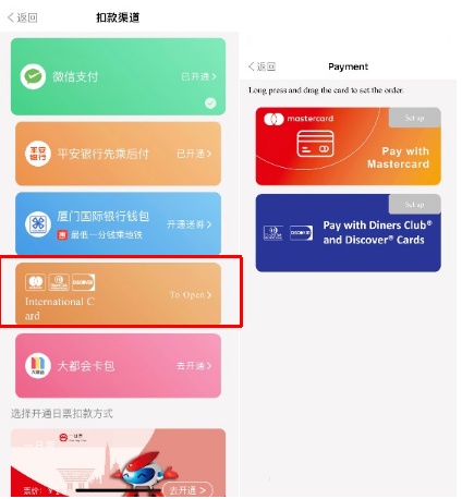 如境外来沪人员持有万事达卡(Master Card)或大来卡(Diners Club)这两种外卡,则可直接在“Metro大都会”App微信支付渠道中的“国际卡”中,选择其一开通支付渠道,实现乘车功能。