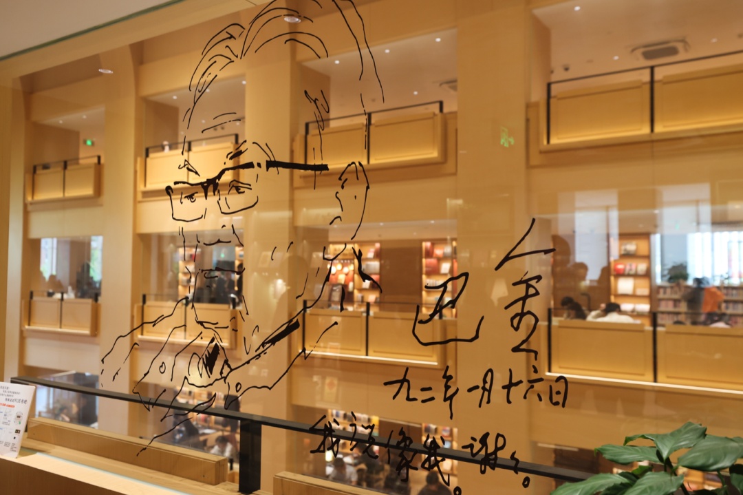一走进主题阅览区,抬眼就能看到玻璃上巴金的肖像画。这是1992年,翻译家、作家、美术家高莽陪外宾来上海,期间去巴金家中探望时为他画下了这幅速写像。画完后,巴金为画像签了名。待高莽告辞即将离开时,巴金又向他要了画笔,在签名下边加了一句话“我说像我。谢谢。”