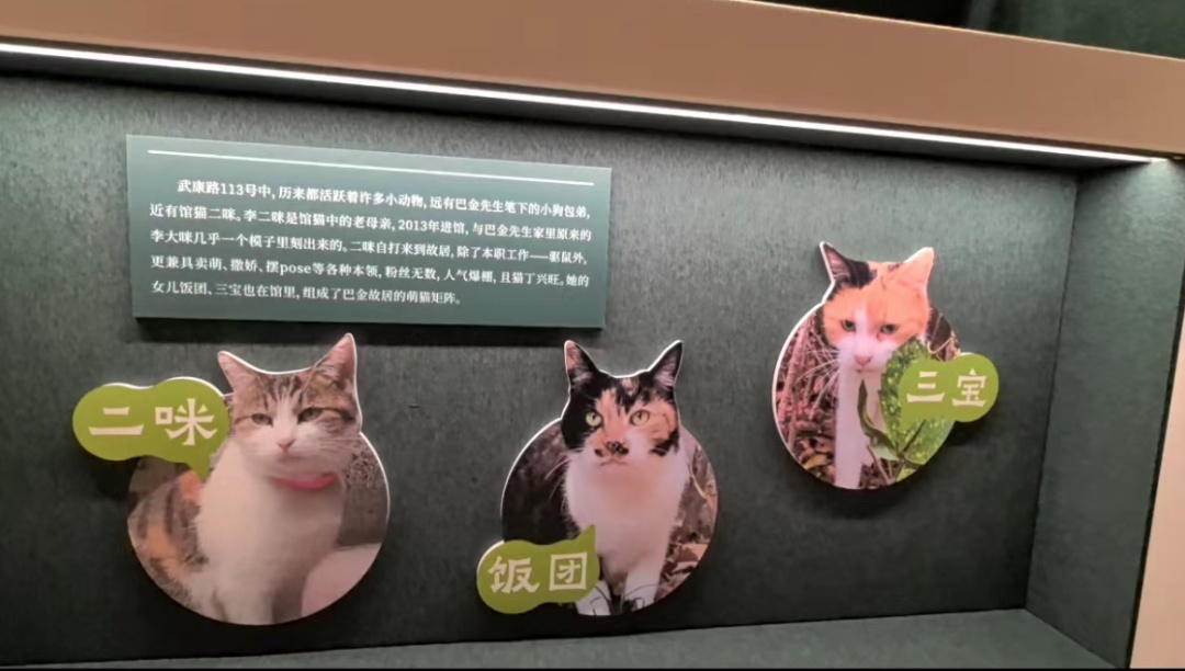 在巴金生活的武康路113号中,历来都活跃着许多小动物,远有巴金笔下的小狗包弟,近有馆猫二咪。据工作人员介绍,李二咪是馆猫中的老母亲,2013年进馆,与巴金家里原来的李大咪几乎一个模子里刻出来的。二咪自打来到故居,除本职工作——驱鼠外,更兼具卖萌、撒娇、摆pose等各种本领,粉丝无数,人气爆棚,且猫丁兴旺。她的女儿饭团、三宝也在馆里,组成了巴金故居的萌猫矩阵。