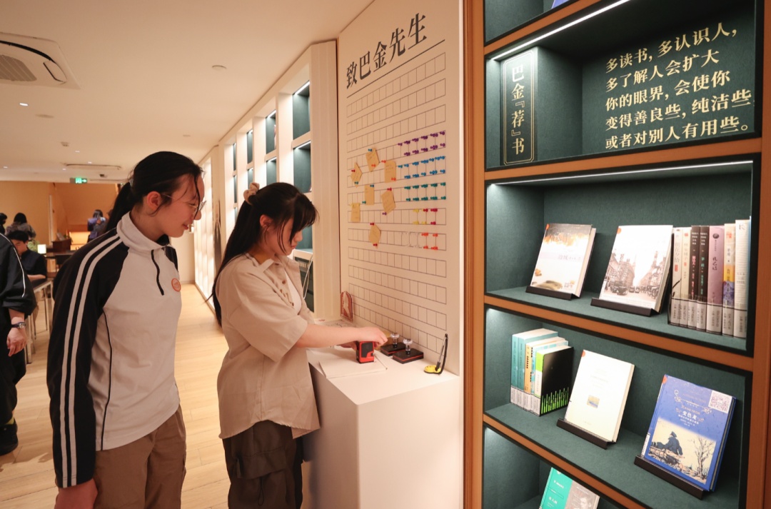 主题阅览区还设置了互动区,并定制了“纪念巴金先生诞辰120周年”专属印章和附有巴金名言的特色书签,供读者在互动区留言盖章打卡。