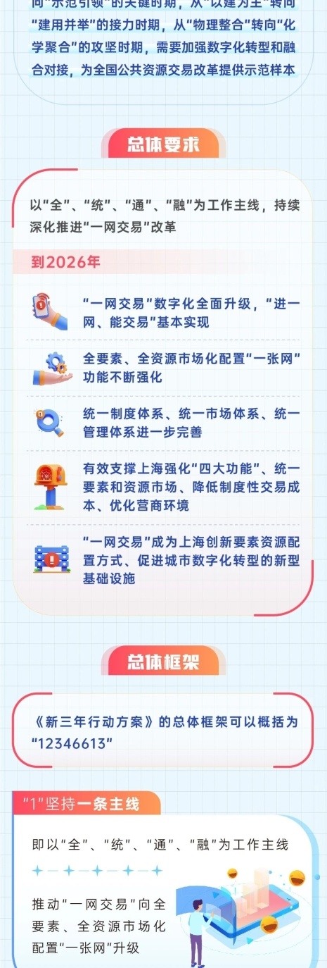 新三年是上海“一网交易”改革从“后发领先”转向“示范引领”的关键时期,从“以建为主”转向“建用并举”的接力时期,从“物理整合”转向“化学聚合”的攻坚时期。上海将以“全”“统”“通”“融”为工作主线,计划到2026年,“一网交易”数字化全面升级,“进一网、能交易”基本实现,成为上海创新要素资源配置方式、促进城市数字化转型的新型基础设施。