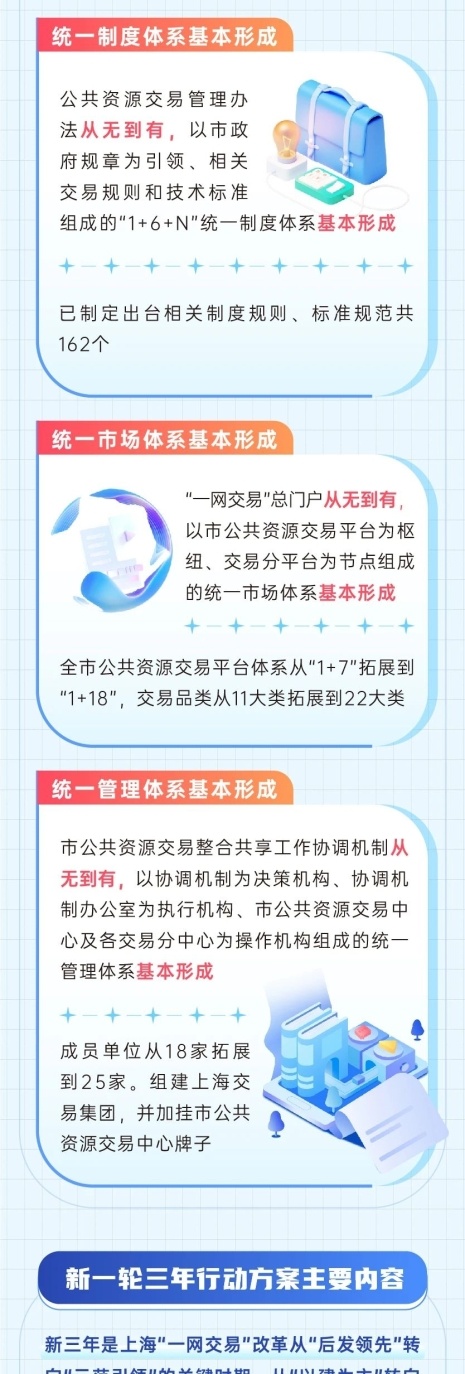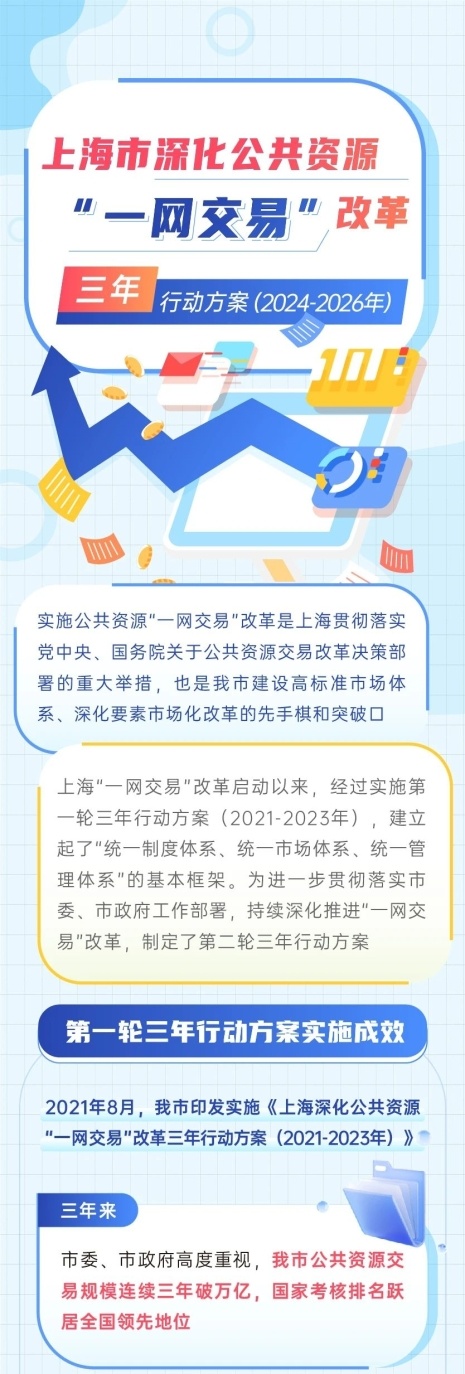 为持续深化推进“一网交易”改革,第二轮行动方案《上海市深化公共资源“一网交易”改革三年行动方案(2024-2026年)》(点击文末“阅读原文”可查看全文)近日发布。
