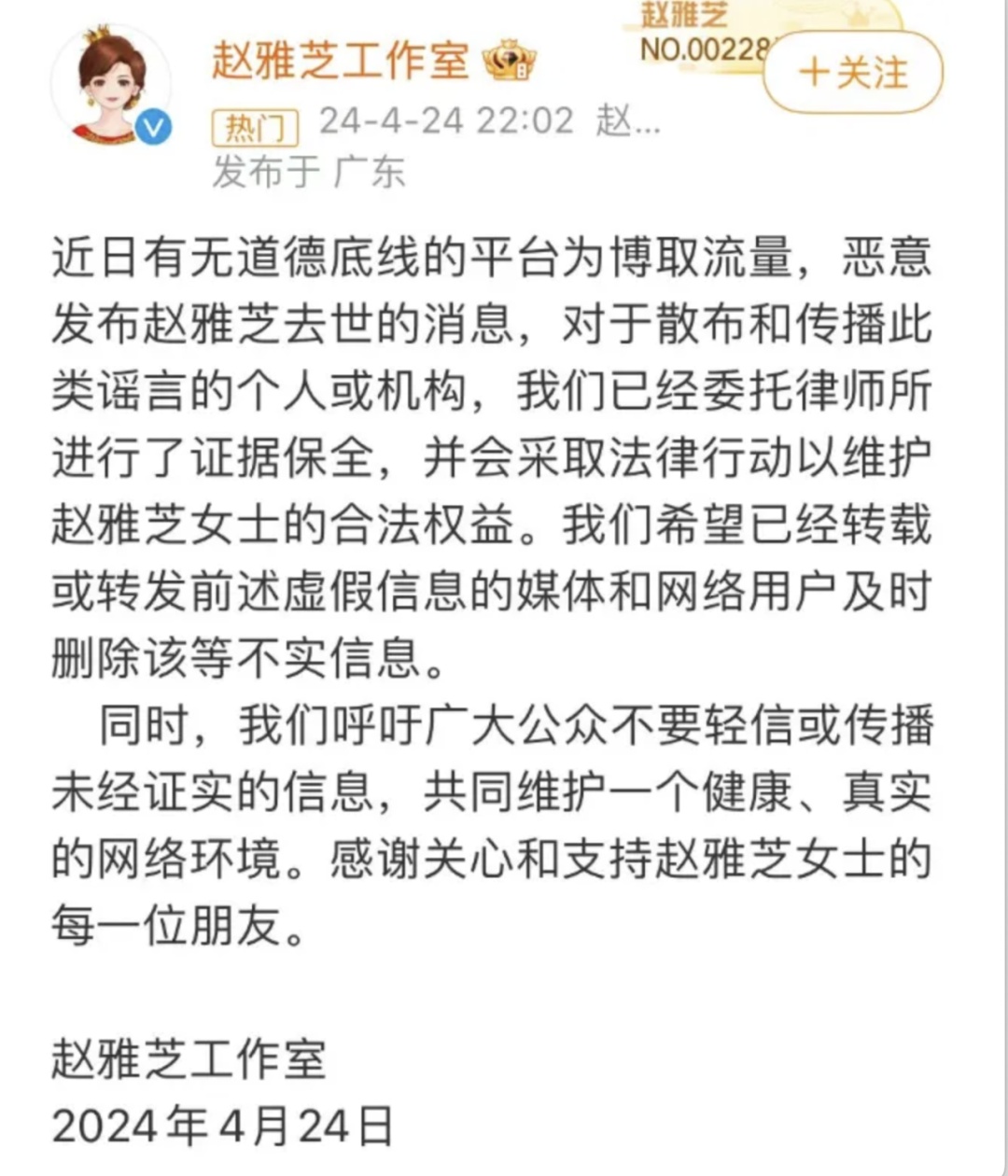 近日,网传消息称演员赵雅芝去世。4月24日晚,赵雅芝工作室发文辟谣去世传言,并表示已经委托律师所进行了证据保全,会采取法律行动以维护赵雅芝女士的合法权益。