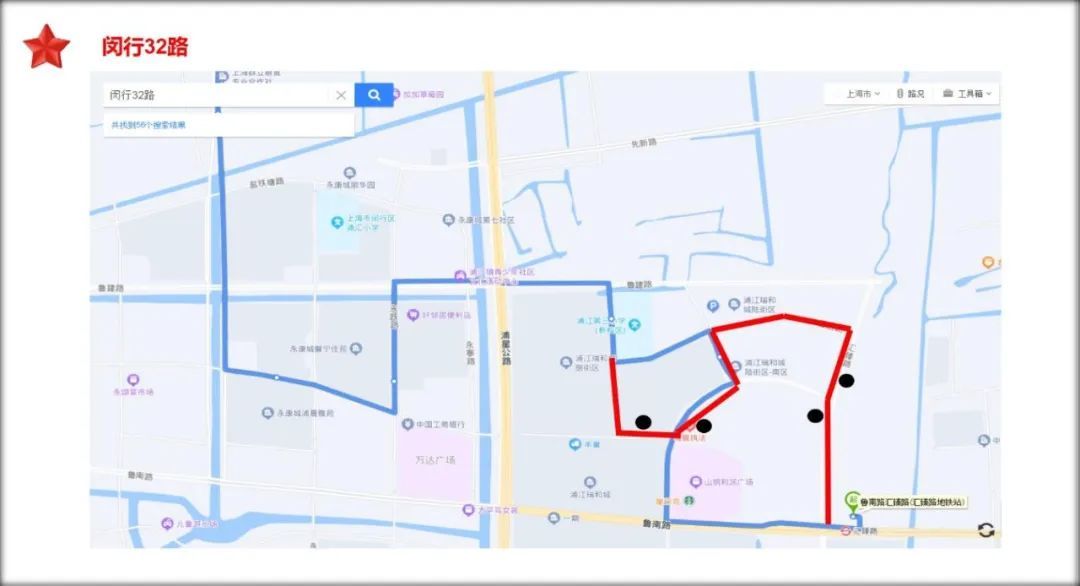 今年初,结合汇臻路(鲁建路-鲁南路)、鲁康路(鲁坤路-新浦泾)的道路通车,闵行32路已经实施了线路优化,相比原先,不再经过通行压力较大的鲁浩路(汇秋路-汇舒路),并增设1组双向站点汇臻路鲁坤路站,增设鲁坤路鲁康路站(往汇臻路地铁站方向)、鲁康路鲁坤路站(往永德路地铁站方向),共4个公交站点,大大提高了该区域的公交通行能力和群众出行的便捷性。