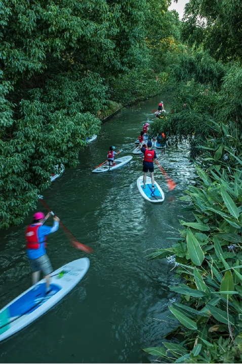 在岑卜村,你可以划着皮划艇在绿树环绕的湖面亲近自然,接受飞鸟和鱼儿的围观,也可以前往依湖而建的“一尺花园”,喝一杯咖啡,品尝一下花园秘制人气单品,满足你夏季雀跃的食欲。