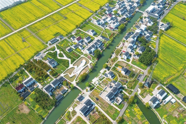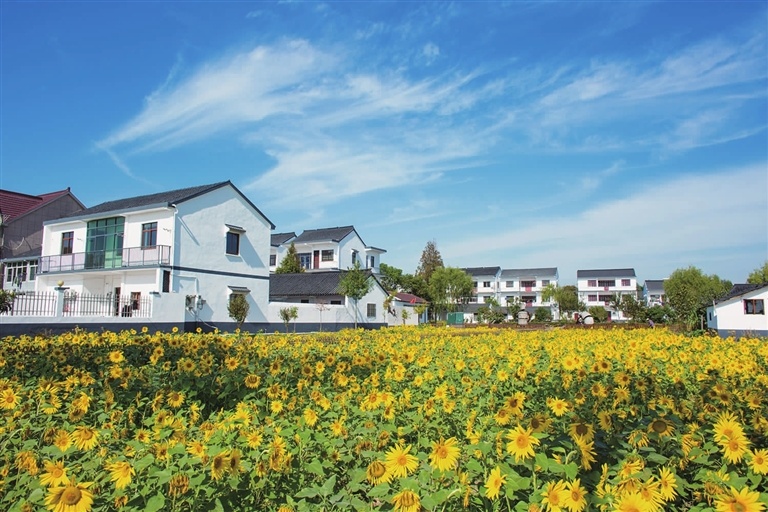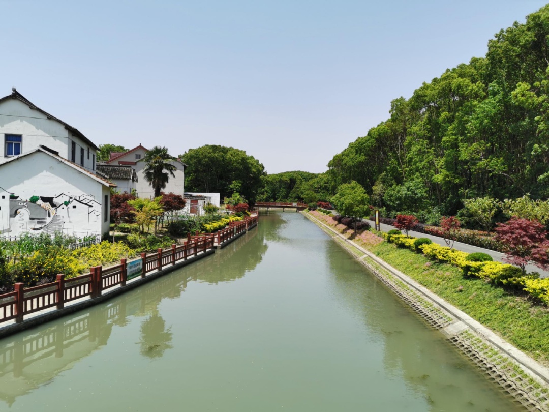 东庄村通过公共空间功能提升、民居风貌改造提升、庭院设计,满足村民休闲休憩、健身运动的需求,重现“小桥流水、粉墙黛瓦”江南水乡的建筑肌理:农家墙上的巨幅节气水墨画,与“小菜园”“小果园”“小公园”相互应和;岸上的白墙黛瓦屋舍与河流中的荷花等水生植物相映成趣,呈现出一副宜居宜业的美丽画卷。