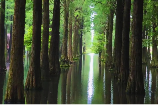 园内一半的面积被水覆盖,风光旖旎,主要景观有水上森林、杉林鹭影、青韵野径、湿地湾堰、芦雪迷踪等。