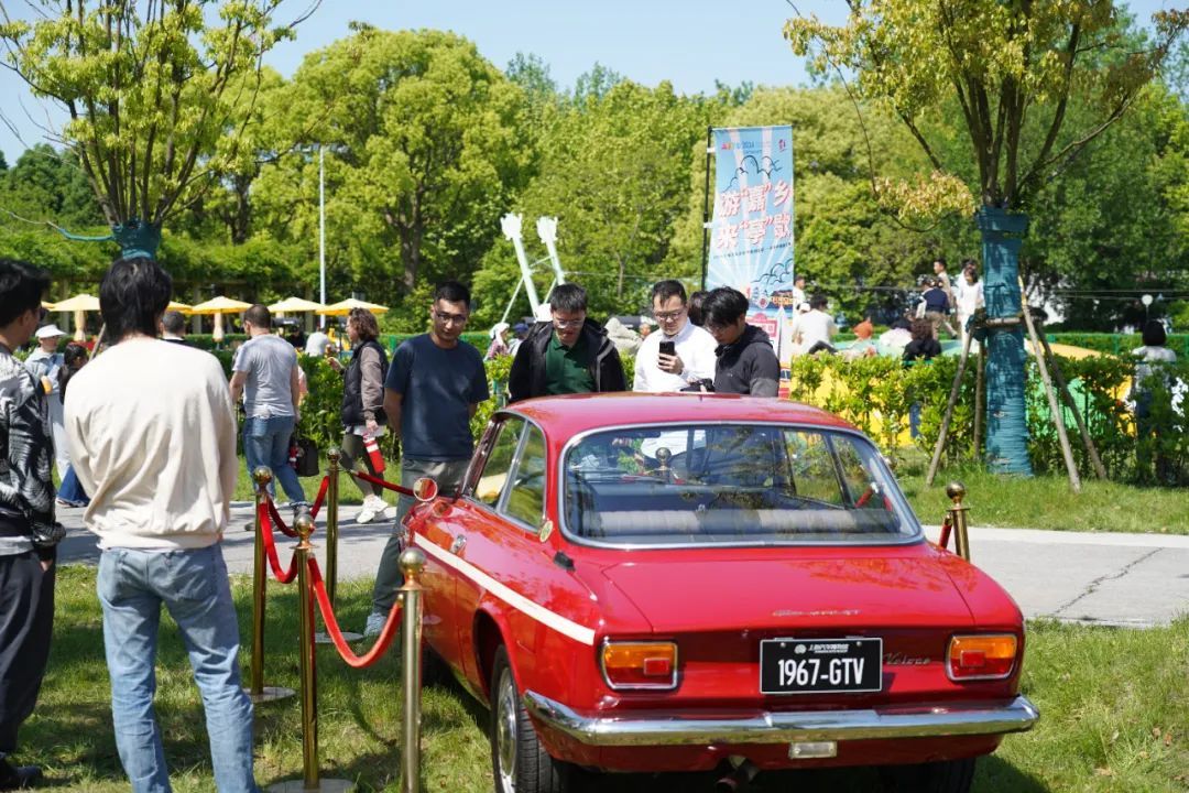 在乡悦华亭景区的草坪区,1967年的阿尔法•罗密欧、1974年上海牌SH760A等古董车在阳光的照耀下格外亮眼,吸引市民纷纷驻足合影。