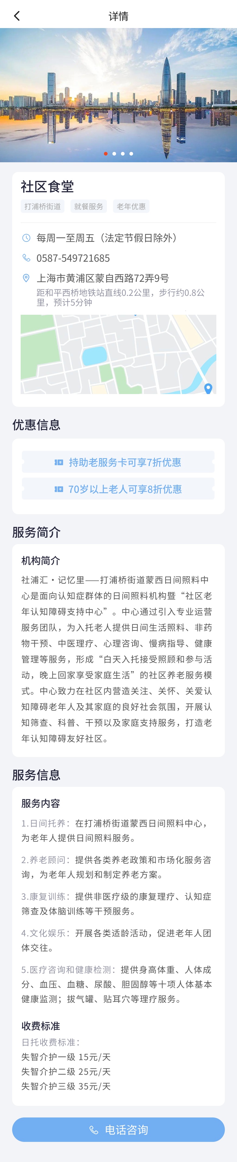 2.进入服务详情页面后,用户可以查看服务的名称、图片、所属街道、服务类型、服务时间、联系电话、地址等基本信息。
