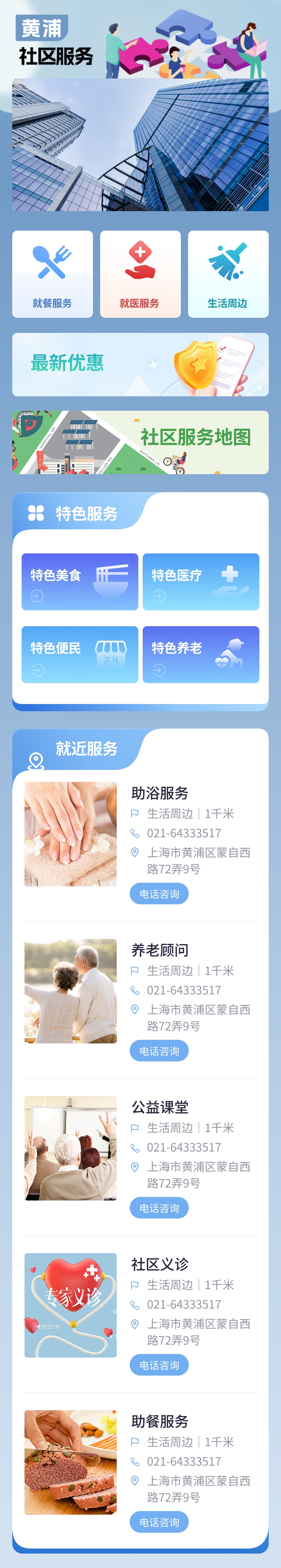 社区服务平台旨在为上海黄浦App用户提供丰富的社区服务信息及点位查询,内容涉及就餐服务、就医服务、社区服务地图、特色便民、为老助餐、长者照护等板块,不仅极大地提升了智慧社区的建设,也为广大社区居民提供了更为精准的社区服务查询功能。