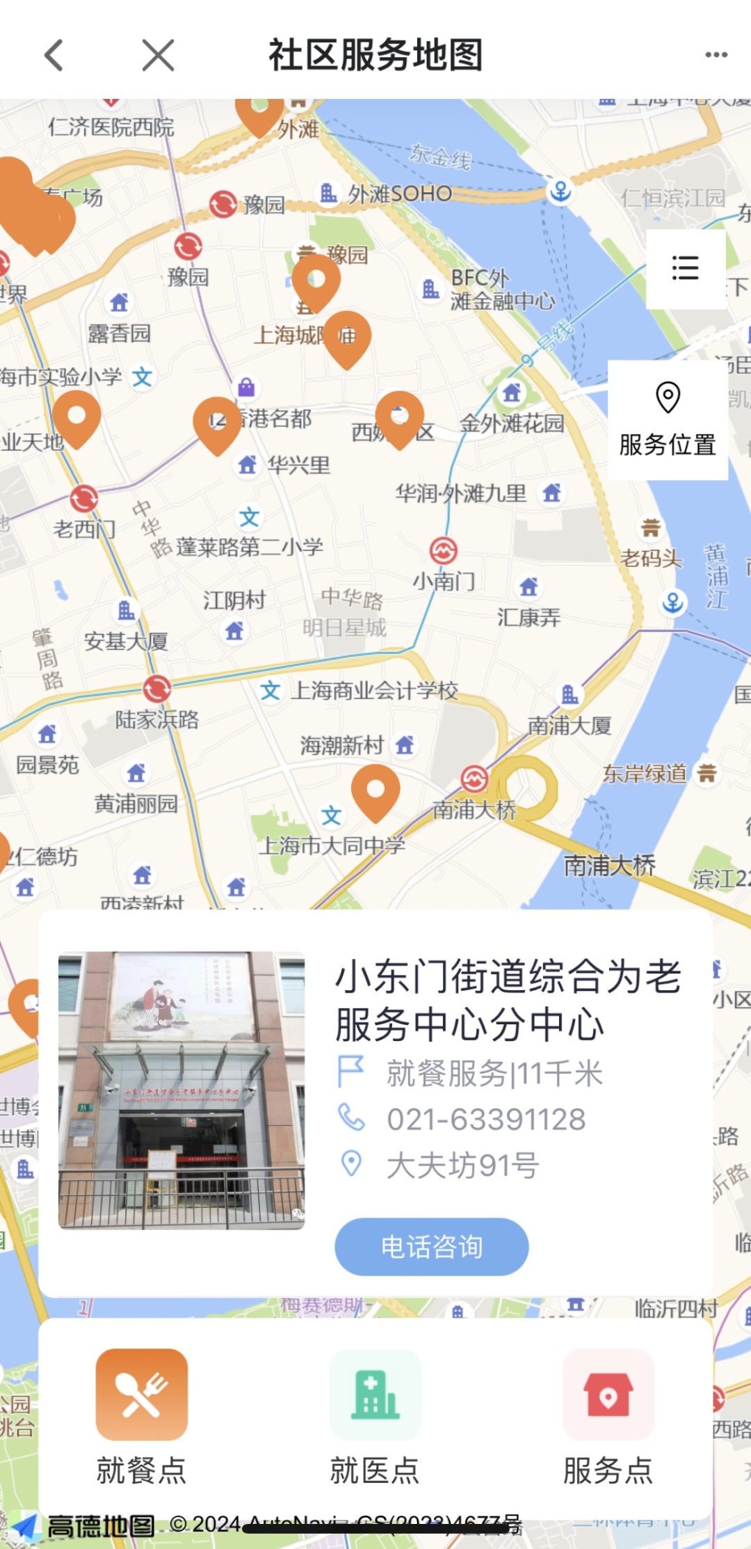 3.首页“社区服务地图”板块,则显示用户当前位置附近的服务,点击地图上的地图图钉,即可查看相关服务信息。