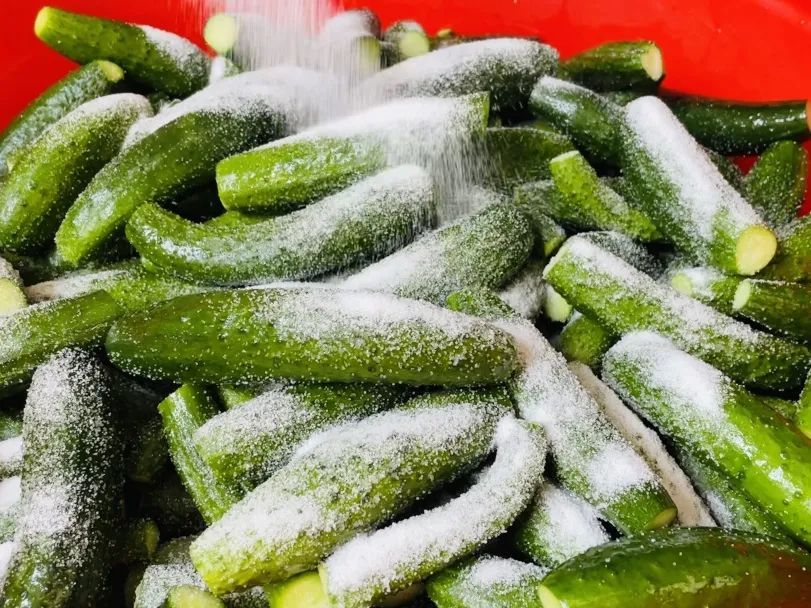 想要黄瓜有更加清脆的口感,还需要进一步杀水。将黄瓜内压出的水分倒掉,加入少量盐进行搅拌,再用重物继续压住。