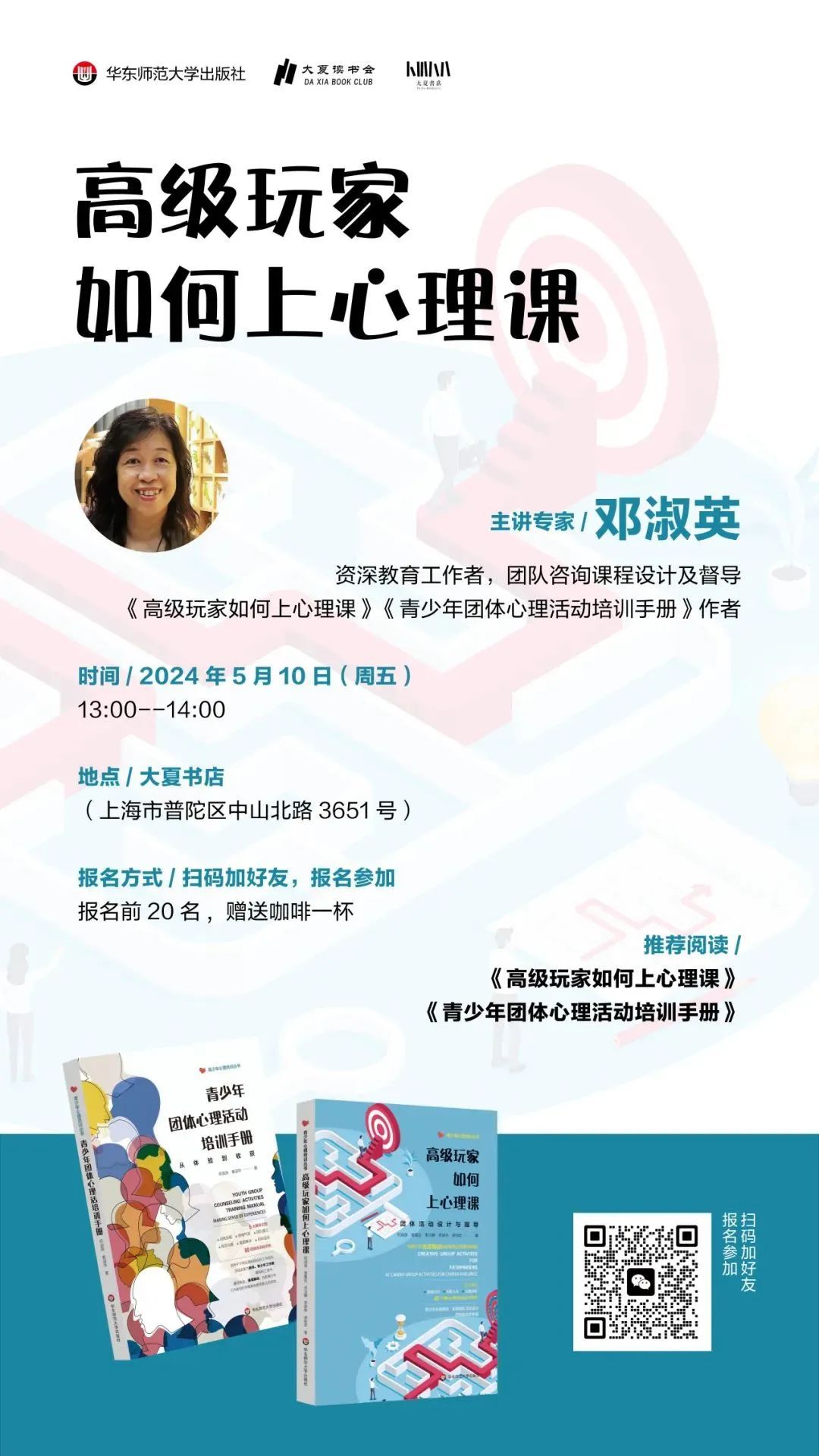 华东师范大学出版社邀请了资深教育工作者邓淑英,围绕团队心理活动设计与指导,介绍心理咨询师如何设计一场团体游戏,通过游戏,有效的解说,帮助参与者将心理活动中得到的宝贵经验内化为个人成长的动力。