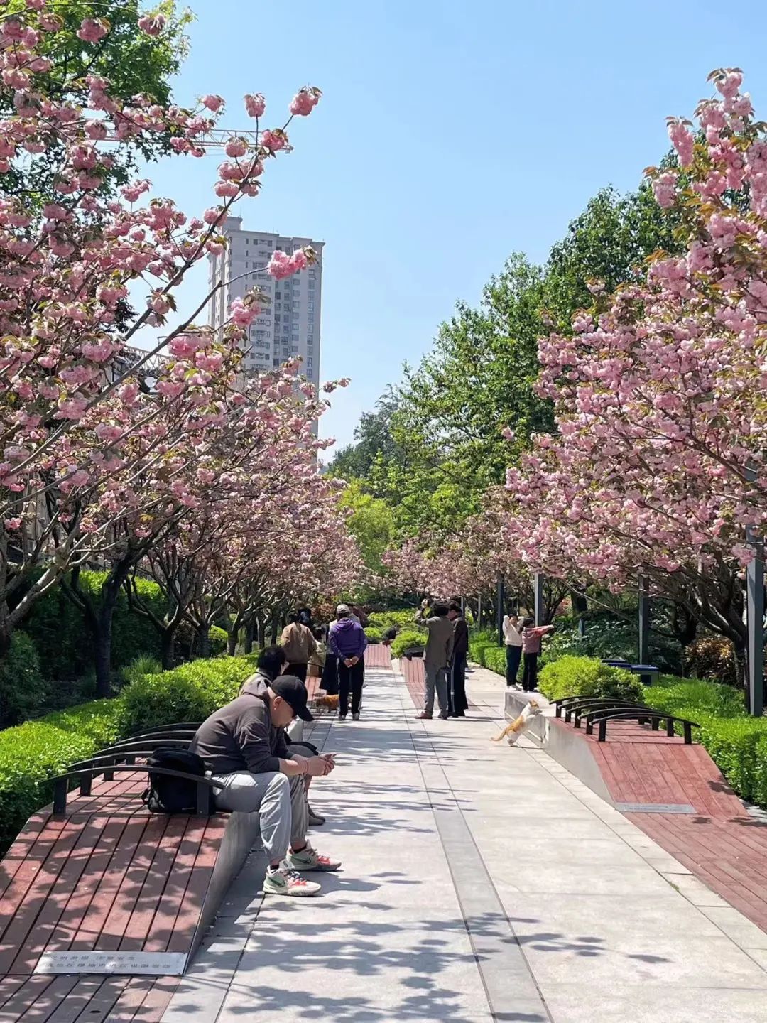 南京西路永源路路口的永源浜绿地是静安寺商圈白领放松身心的“世外桃源”之一,晚樱盛开时更是如同一块娇艳的宝石镶嵌在繁华的闹市中。