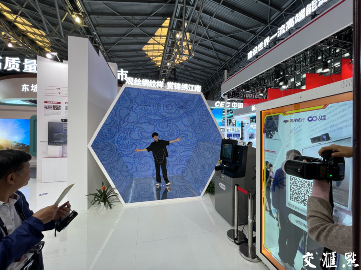 在此次品博会新设的专题展区,苏州作为江苏极具代表性的“美好之城”城市品牌独立参展。穿过苏州展厅内古色古香的隔扇门,映入眼帘的数字丝绸纹样展示区极具视觉冲击力。源自中国苏州、意大利、法国、瑞士四地共计百余款纹样以数字化形式呈现在六边形装置中,观众可以亲身进入装置内部打卡拍照,感受被“纹样万花筒”包围所带来的震撼。