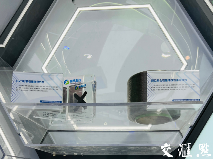“这次品博会,我们带来了一款CVD封装石墨烯导热片。它是由我们产业园内的常州富烯科技股份有限公司生产的,应用高分子聚合物通过CVD技术将石墨烯导热材料封装制备而成,具有良好的导热、轻质及绝缘性能。”江南石墨烯研究院产业运营专员马佳原介绍道。