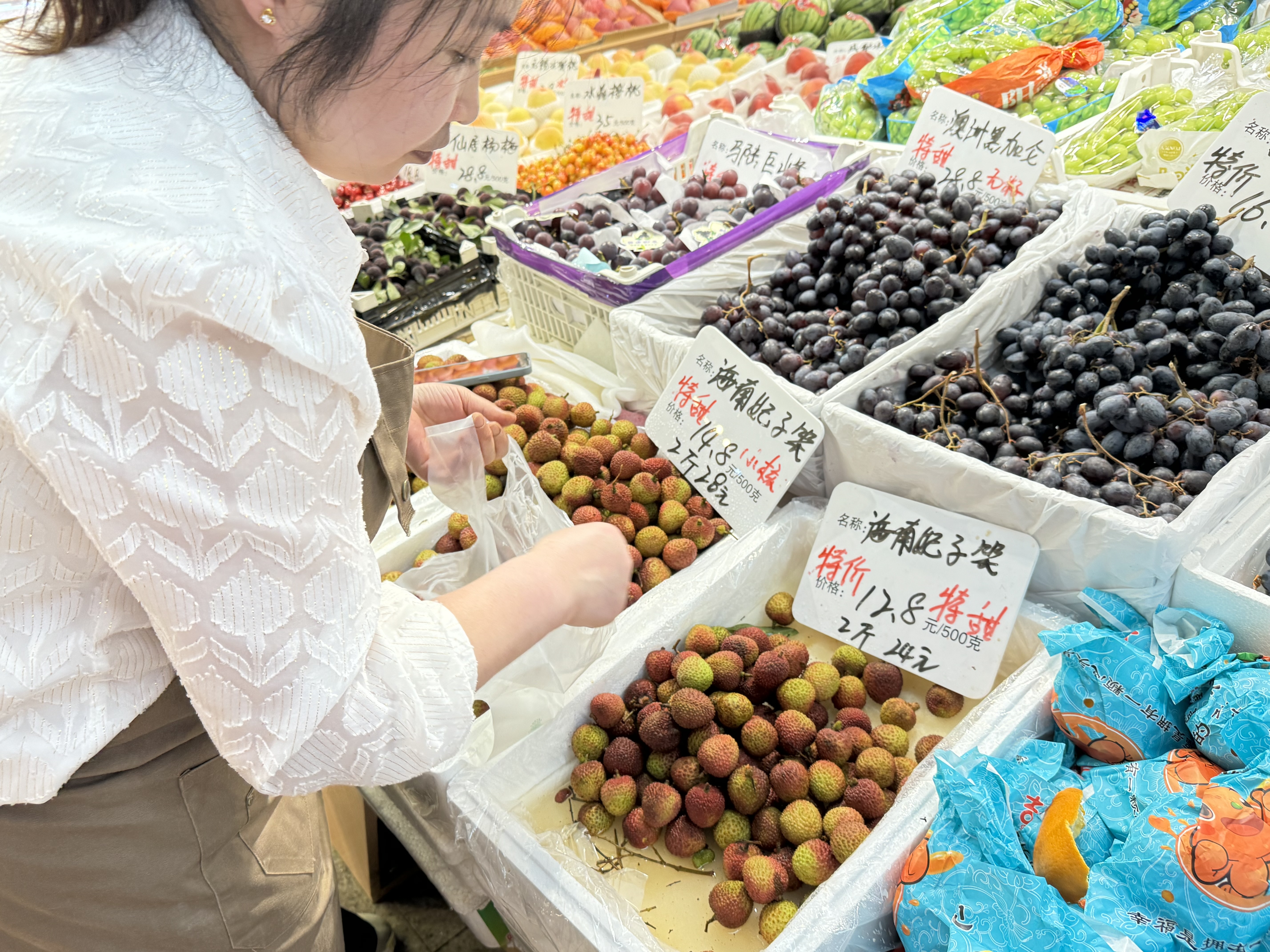 在另一家水果摊位,店员告诉记者,海南妃子笑荔枝上周初上市时单价超过了二十元,本周价格开始下滑,降至12.8-16.8元/斤,来到了销售高峰期。除了荔枝,南汇青皮绿肉甜瓜、仙居杨梅、东山枇杷、无锡水蜜桃等夏季水果近期也较受欢迎。