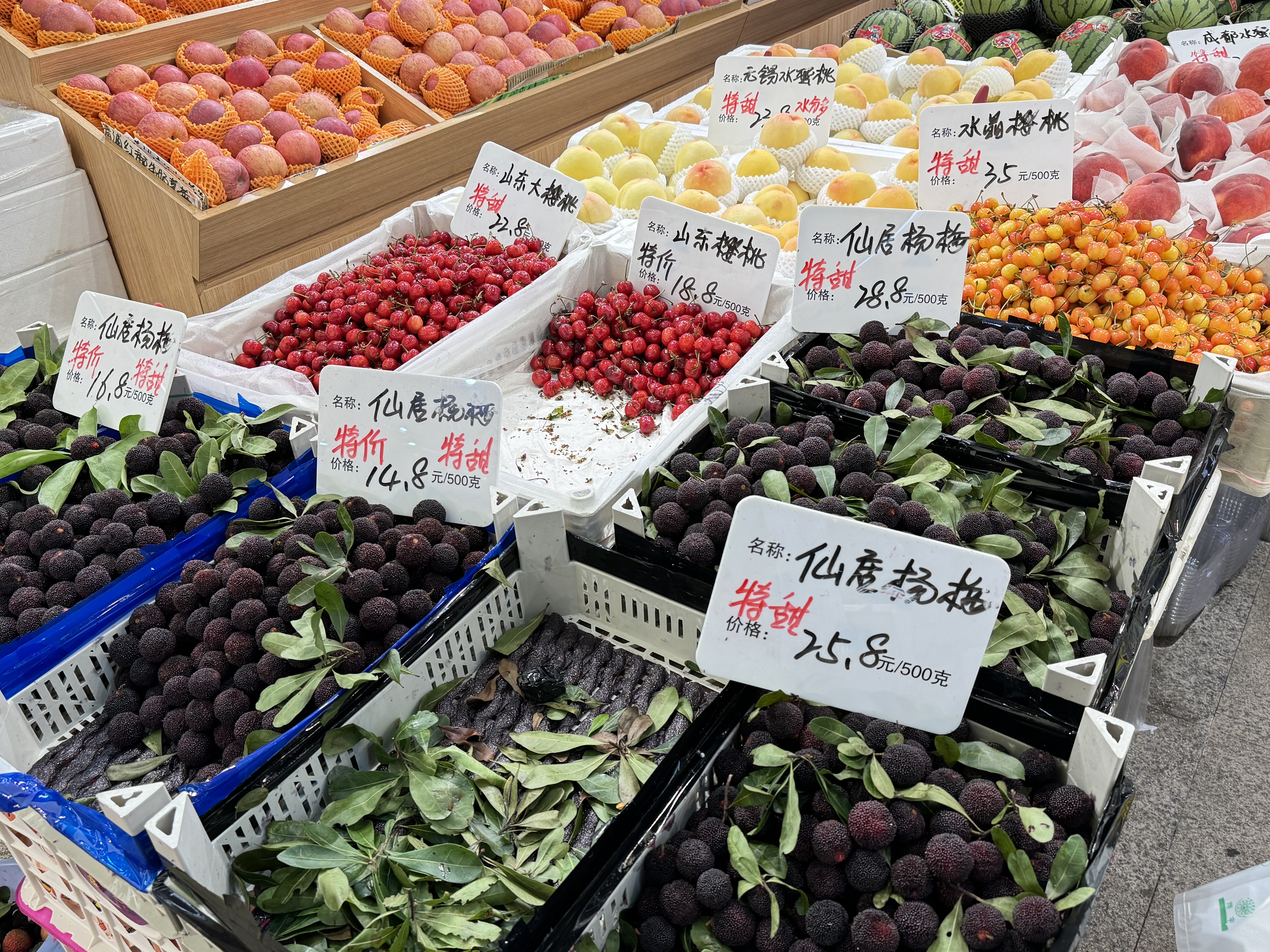 5月21日,记者走访静安各大商超、水果店发现,北方时令鲜果和南方热带水果均进入上市高峰期,水果供应数量充足、品种丰富。草莓、杨梅等水果相较于前期上市时价格有所下降,而抢鲜上市的樱桃、荔枝等夏季水果价格与去年基本持平。