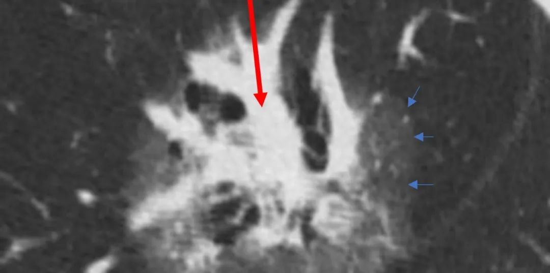 混合磨玻璃结节,周围蓝色箭头所示为磨玻璃成分,中央红色箭头为实性成分