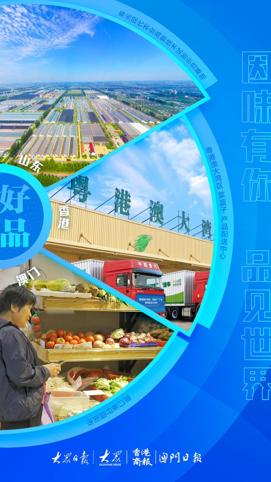 近年来,山东主动融入粤港澳大湾区建设国家战略,在香港、澳门、深圳等重点城市多次参展,组织“好品山东”走进大湾区系列推介活动。截至2023年10月20日,共有248家山东企业获得大湾区“菜篮子”生产基地和加工企业牌照,建成寿光、莘县2家大湾区“菜篮子”产品配送中心,销往大湾区的农产品达500多亿元,每年运送的新鲜蔬菜约占大湾区的18%,让山东好品与港澳地区之间形成“因‘味’有你 品见世界”的良好局面。