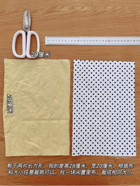 第一步:旧衣服剪下两片长方形,高28厘米、宽20厘米,或者根据布料大小任意裁剪,找一块闲置里布,裁成相同大小