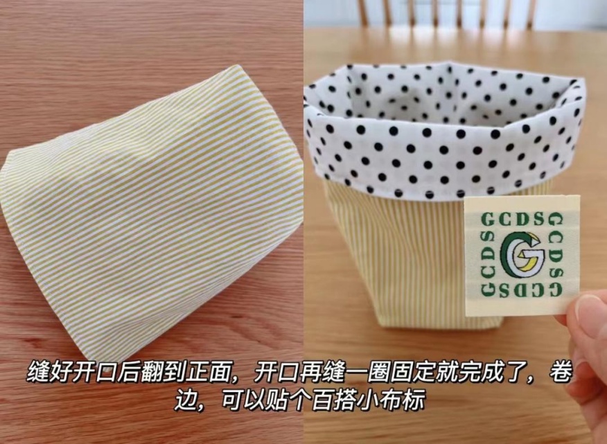 第六步:缝好开口后翻到正面,开口再缝一圈固定,卷边