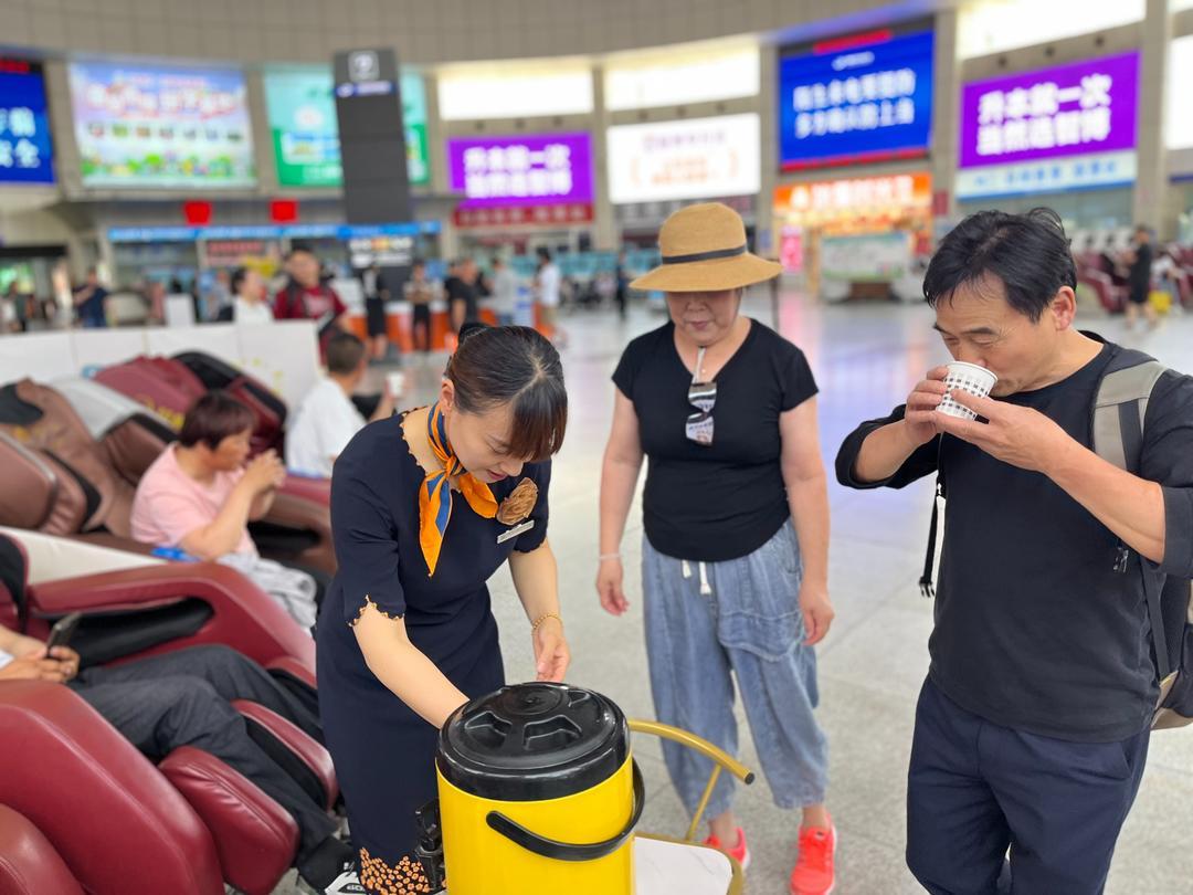 面对持续的高温天气,济南长途汽车总站迅速启动高温天气应急预案:加强了对候车大厅、售票大厅等公共区域的通风降温工作,确保室内温度适宜。加强车辆的安全检查工作,确保每一辆客车都能在高温天气中安全稳定运行。为帮助旅客解暑降温,总站还特地在候车大厅设立了免费饮水点,为旅客提供冰冻水和绿豆汤,同时准备了霍香正气水等防暑药品,以备不时之需。