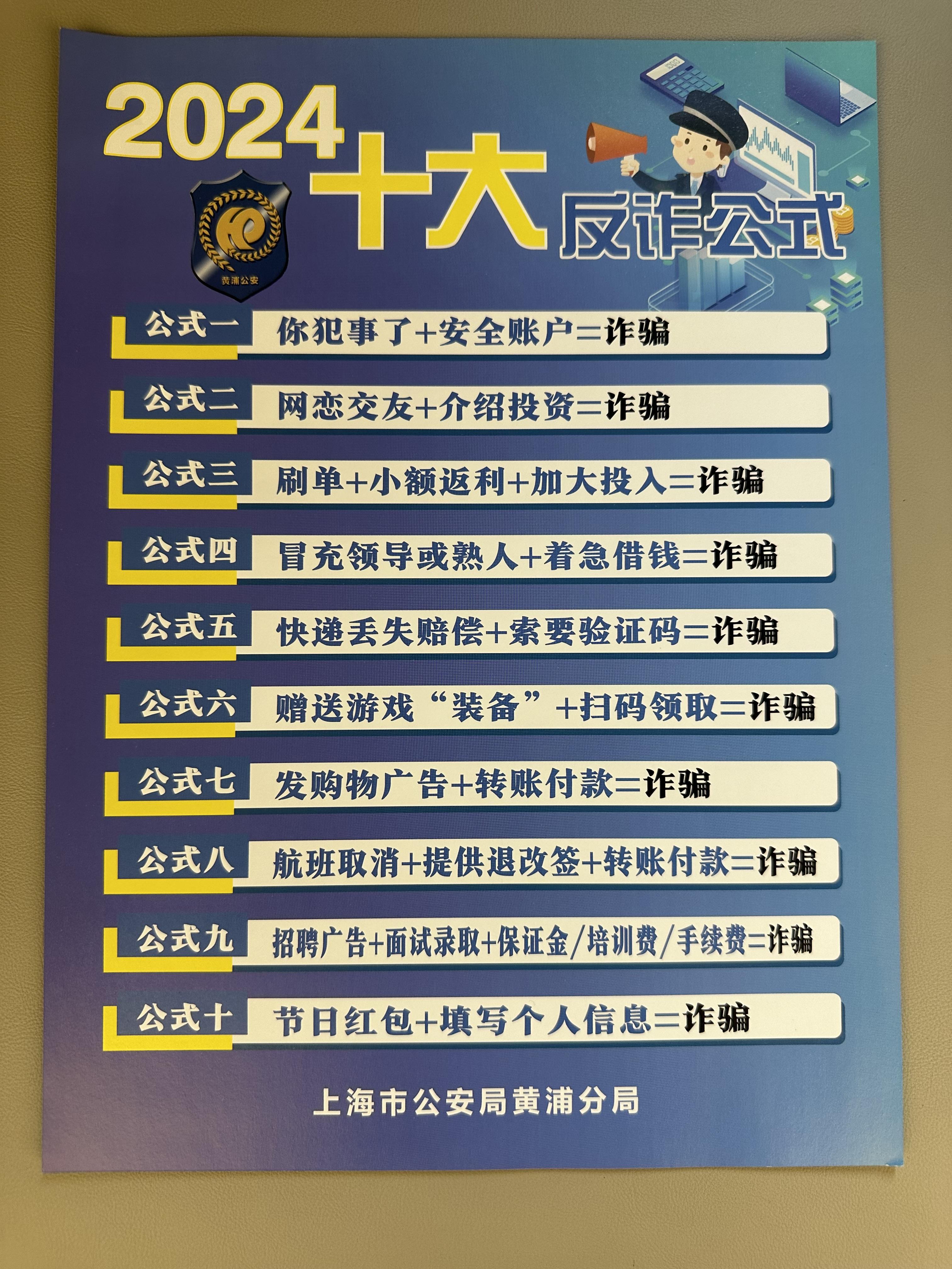 豫园商圈客流量大,人员密集,来往游客众多,很多外来人员并不了解相关情况,往往就让不法分子有了可乘之机。为了让各类人群知晓情况,一份由公安黄浦分局制作的“2024十大反诈公式”应运而生,这份宣传单上明确写明了十种不法分子惯用的诈骗“套路”,比如“你犯事了+安全账户=诈骗”“快递丢失赔偿+索要验证码=诈骗”等,通俗易懂、一目了然。“这份宣传单我们将在社区商圈内广泛发放。”相关人员表示。