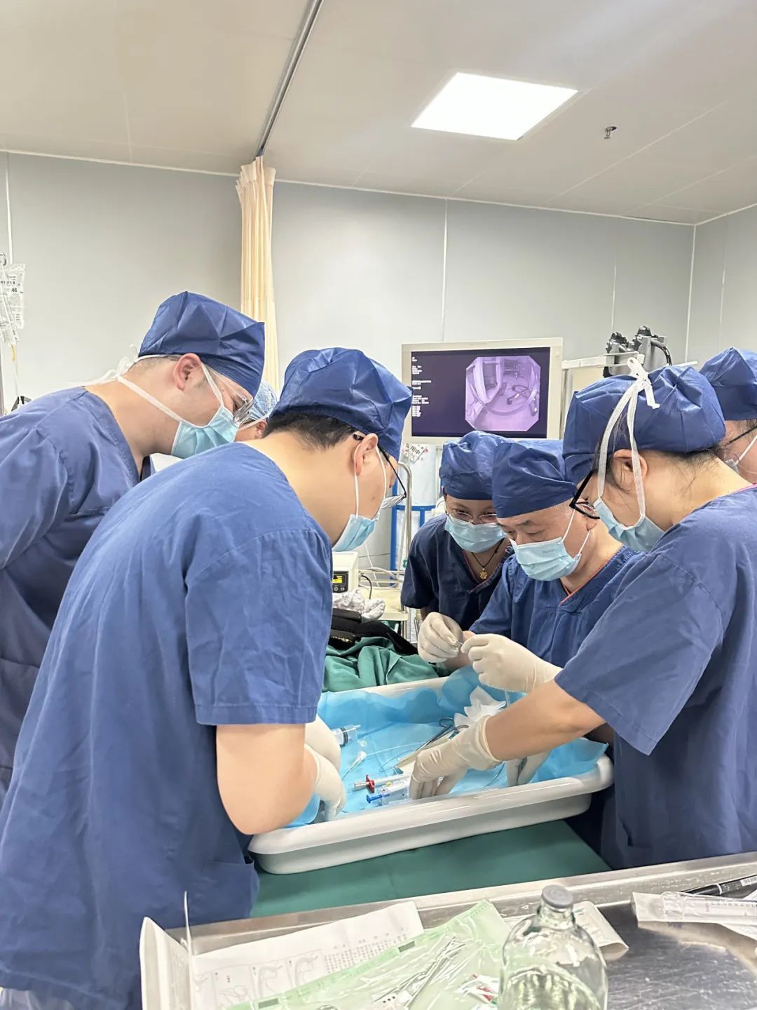 鉴于患儿年龄小,刘海峰医师团队进行了周密计划和精心准备。首先在胃镜下充气,精确定位胃壁穿刺点。由于新生儿的胃腔较小且胃体与肝脏毗邻,穿刺过程中全体医护人员屏住呼吸,小心翼翼避免穿刺出血及损伤周围脏器。刘海峰主任医生沉着冷静,一气呵成地完成了胃壁穿刺和胃壁固定器的置入,最终成功放置十二指肠空肠管,通过不断切换观察确保空肠管准确置入空肠,整个手术过程行云流水,顺利完成。