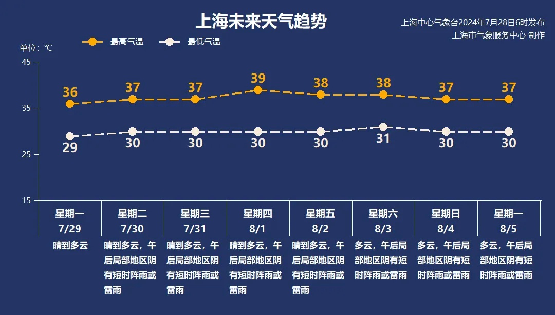 伴随着副热带高压加强西伸,本市正迎来第三轮高温热浪天气。上海中心气象台预计,8月5日之前本市将维持晴热高温天气,下周极端最高气温可达39℃左右。同时,受高温天气和海陆风环流影响,下周午后到傍晚容易出现局地强对流天气,可能伴有雷电、短时强降水和雷暴大风。