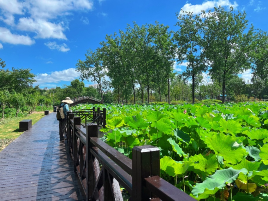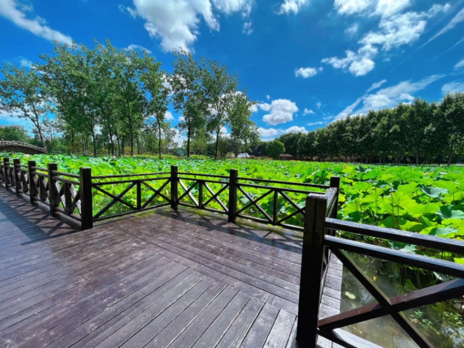 木栈道宛如一条通往梦幻仙境的小道,漫步栈道、近水赏荷,惊艳绝伦的夏荷美景触手可及,更能体会“接天莲叶无穷碧,映日荷花别样红”的诗中美景。