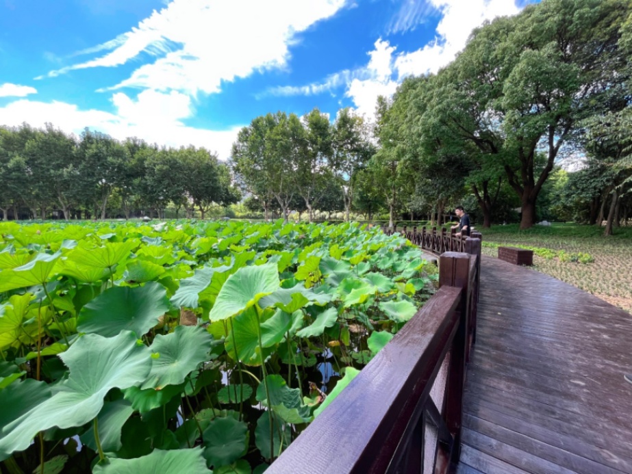 夏季,正值荷花盛放时节,由于初夏的雨水较为充沛,因此荷花池边的道路经常会泥泞不堪,不便于游客赏荷。此次,公园公司对荷花池周围道路进行改造,打造了一条木栈道,木栈道总长为150米,宽度为2米,设有围栏,木栈道一共有3个观景平台,中间为最大的平台,两边为小平台。