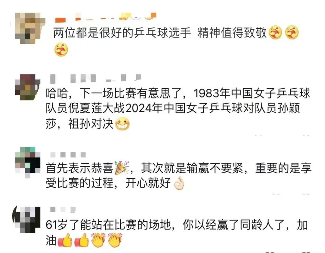 六十多岁的年龄还能参加奥运会,对我来说真的很荣幸,我能和孙颖莎碰到,就已经是巨大的成功了。成绩不重要,重要的是享受比赛。