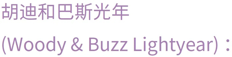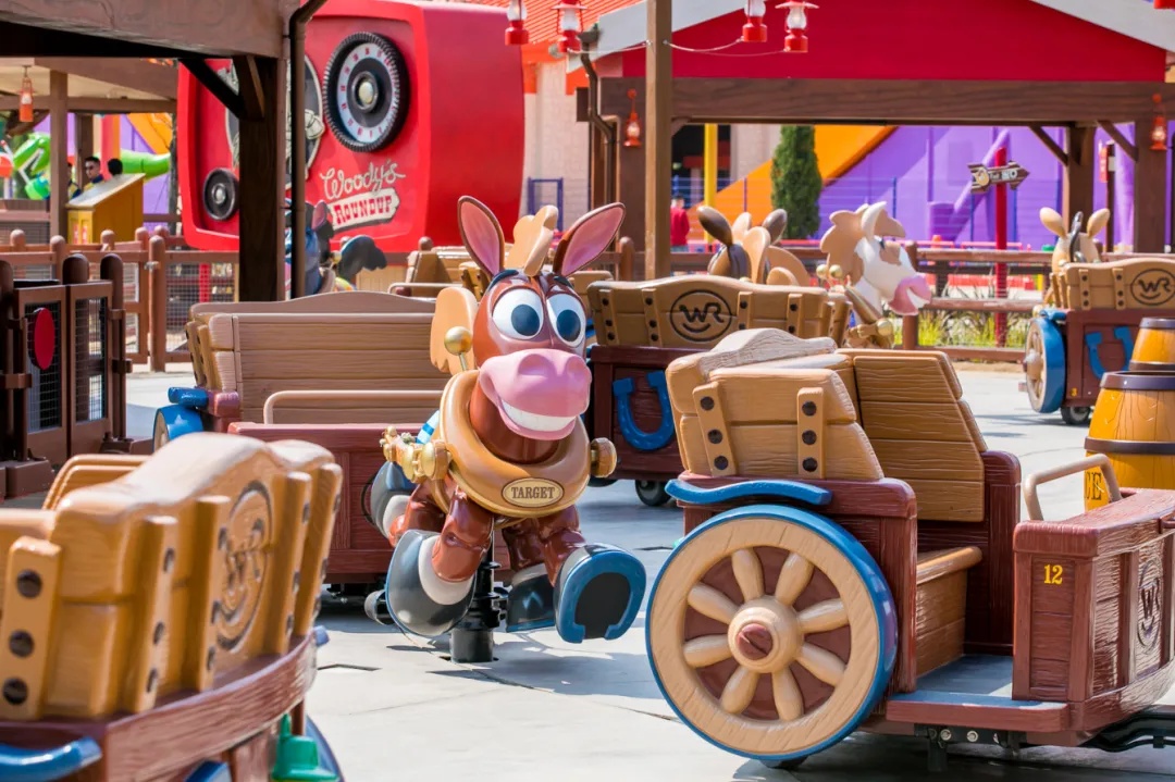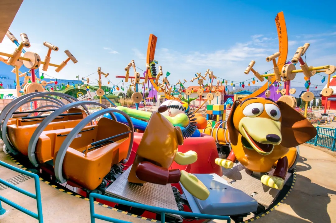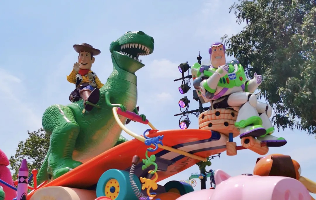 《玩具总动员》的主角是小男孩安迪的玩具——胡迪、巴斯光年,他们和其他的玩具们经历了一连串的冒险。电影从玩具的视角展开,也给观众们提供了一个全新的角度观察我们熟悉的世界。这也是为什么我们进入“迪士尼·皮克斯玩具总动员”主题园区时,感觉我们“变小”了,玩具们“变大”了。在这里我们就是玩具,要带着勇气和胡迪、巴斯光年一起冒险!