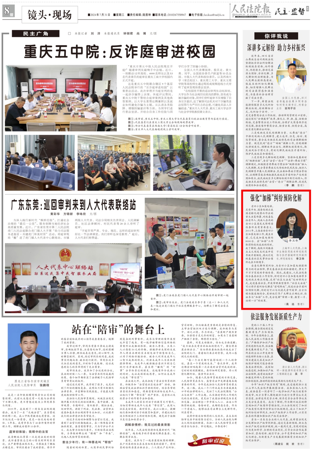 妥善化解邻里纠纷、为老旧小区加装电梯提供有力的司法保障,事关基层社区的和谐稳定,事关千千万万家庭的幸福安居。因此,我建议,人民法院要结合基层社区工作实际,针对老旧小区加装电梯等多发的热点难点问题,采用“社区大法庭”巡回审判方式,走进基层社区,开庭审理典型案件。“社区大法庭”可以将矛盾纠纷化解在“前哨阵地”,促进社会矛盾纠纷预防化解,同时还可以与沉浸式旁听庭审、全方位媒体报道相结合,更好地引导广大群众正确认识、依法参与“加梯”工作,充分发挥“审理一案、教育一片、治理一方”的效果。